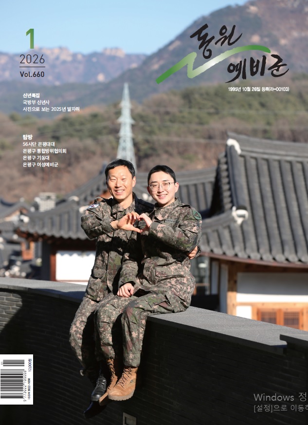 - 신년특집 - 008 국방부 신년사 012 사진으로 보는 2025년 발자취 -인터뷰- 018 56사단 은평대대 026 은평구 통합방위협의회 032 은평구 기동대 038 부기동대장 040 은평구 여성예비군 -국방·안보- 046 안보칼럼 2025년 북한의 행보와 2026년 전망 -예비군·동원- 050 김해 과학화예비군훈련대, 드론 예비군 전사 육성을 선...